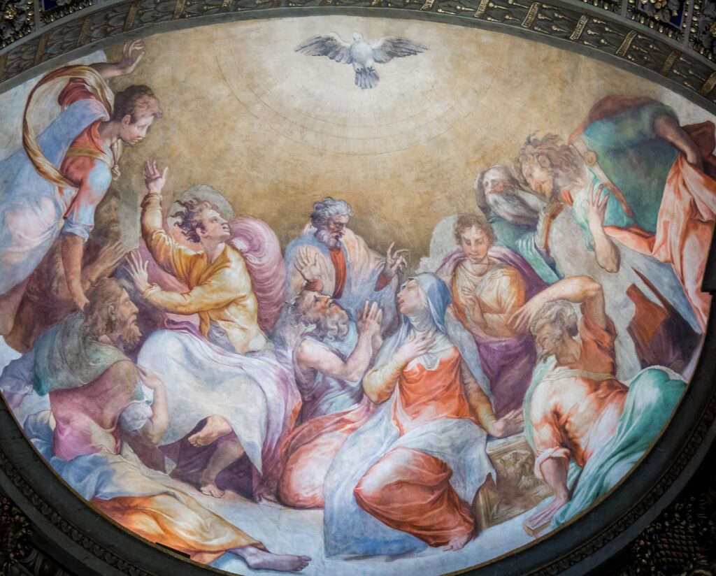 Pfingsten markiert den Ursprung der Kirche. Dort, wo „Zungen wie von Feuer“ auf die Jünger niederkamen (Apg 2,3), öffnet sich der Himmel und Gottes Gegenwart dringt in die Welt ein. Das Feuer, das vom erhöhten Christus gesandt wird, ist die Antwort auf die Sehnsucht der Menschheit nach Leben und Wahrheit. Es entzündet die Kirche, die nun Trägerin und Verkünderin der göttlichen Kraft ist. Denn wer das göttliche Feuer empfängt, bleibt nicht mehr, wie er war.