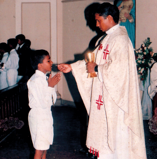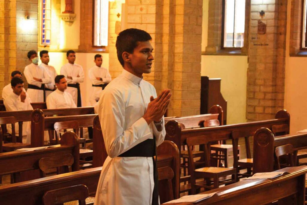 …verkündete der siebenjährige Zweitklässler Kasun seinen Mitschülern, als in der Schule die Frage nach dem Berufswunsch aufkam. 1997 in Panadura geboren, wuchs Kasun mit seinen zwei Brüdern bei seiner gläubigen Familie auf. Die wirtschaftliche Situation der Familie erforderte mehrere Umzüge sowie die Berufstätigkeit der Mutter. Seine tiefgläubige Großmutter sorgte für die Kinder, und ihr leuchtendes Vorbild trug dazu bei, dass die Glaubenserziehung ihrer Enkel auf fruchtbaren Boden fiel: Kasun sehnte sich von klein auf danach, die erste Heilige Kommunion zu empfangen, denn er wollte endlich Ministrant werden dürfen. Als er einen Tag nach seinem Weißen Sonntag zum ersten Mal am Altar dienen durfte, war er überglücklich. Schon ein Jahr vor Erreichen des Mindestalters von 13 Jahren wurde er im Knabenseminar aufgenommen. Einer seiner Brüder ist Seminarist bei den Benediktinern.